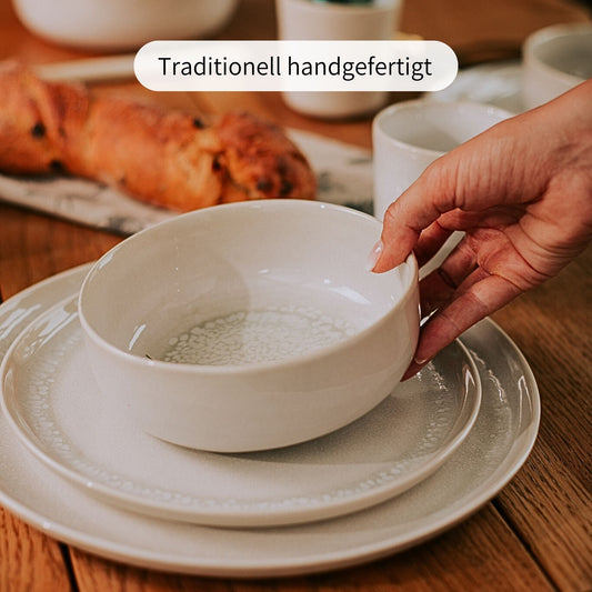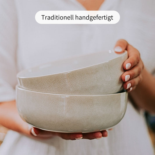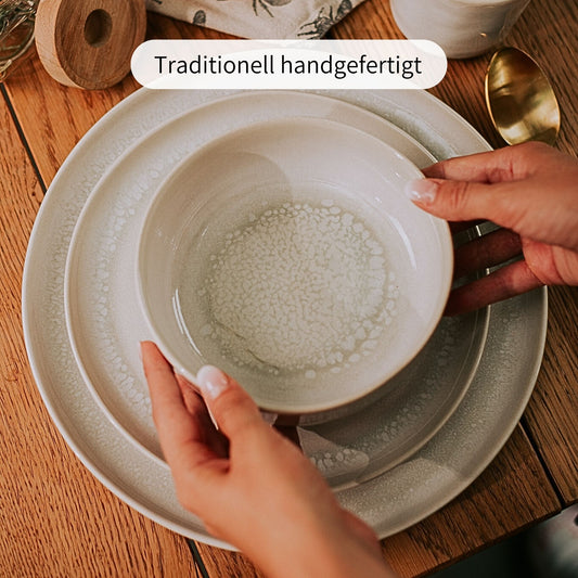 Hochwertiges Keramikgeschirr, wie handgemachte Keramiktassen, handgetöpferte Teller oder Keramikbecher aus Portugal, zeichnet sich durch bestimmte Merkmale aus. Es sollte eine gleichmäßige Glasur, eine saubere Verarbeitung und keine Risse oder Sprünge aufweisen. Die Ränder sollten glatt sein und die Formen sollten einheitlich sein, auch wenn handgemachte Stücke oft kleine Unregelmäßigkeiten aufweisen, die ihren Charme ausmachen. Beim Halten sollte das Geschirr, ob es sich nun um einen Keramikbecher, eine Keramiktasse oder einen Keramikteller handelt, solide und schwer in der Hand liegen. Handgemachte Produkte wie handgemachte Kaffeebecher oder handgetöpferte Tassen zeigen oft das Können und die Erfahrung des Töpfers, so dass jedes Stück ein Kunstwerk ist. Wenn Sie Keramikgeschirr kaufen, sollten Sie auf diese Qualitätsmerkmale achten, um sicherzustellen, dass Sie ein Produkt erhalten, das über viele Jahre hinweg hält.