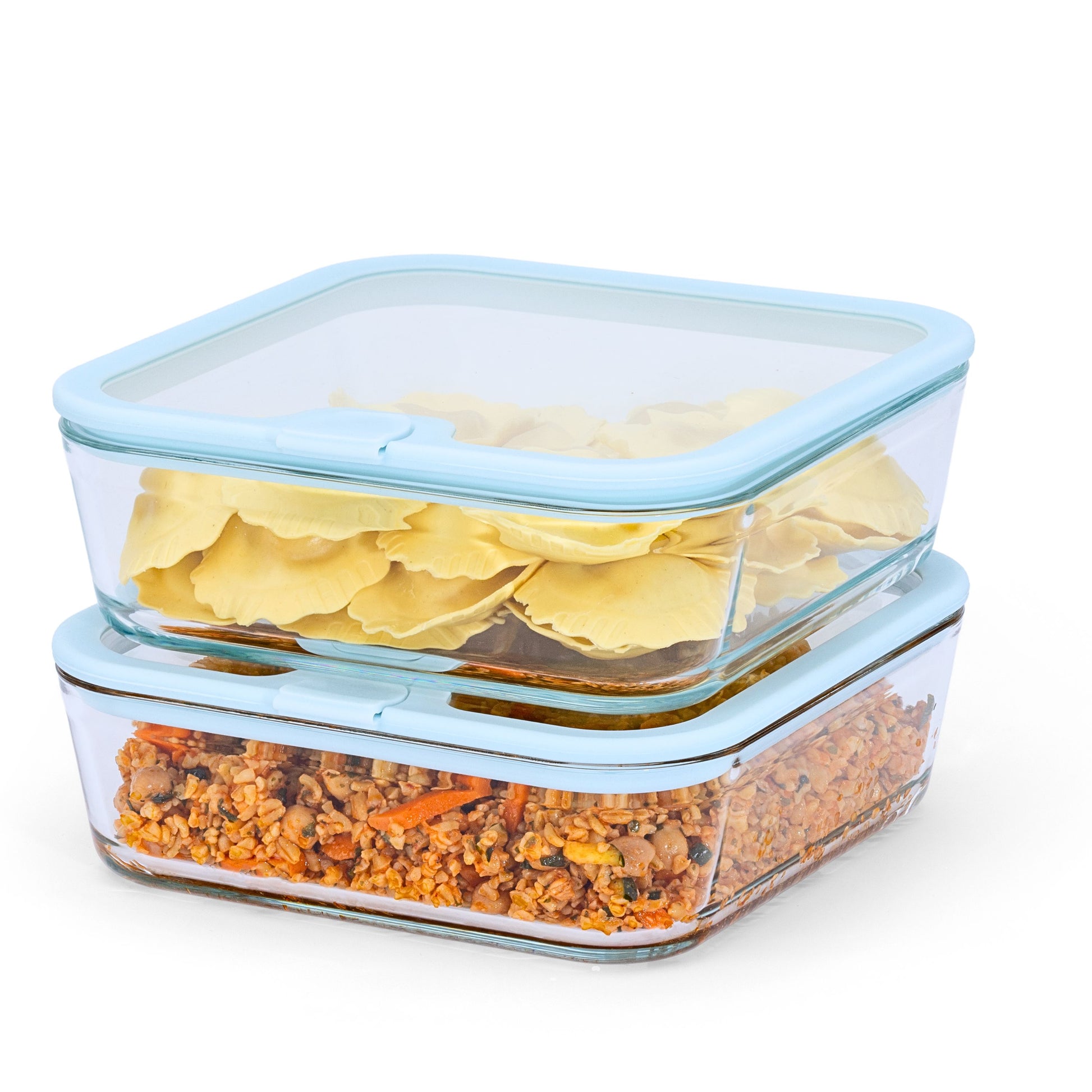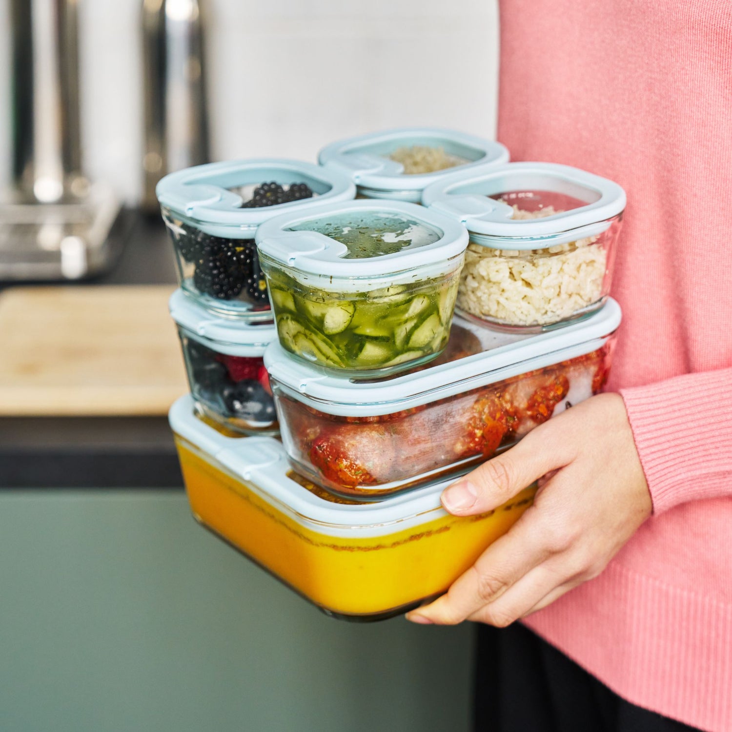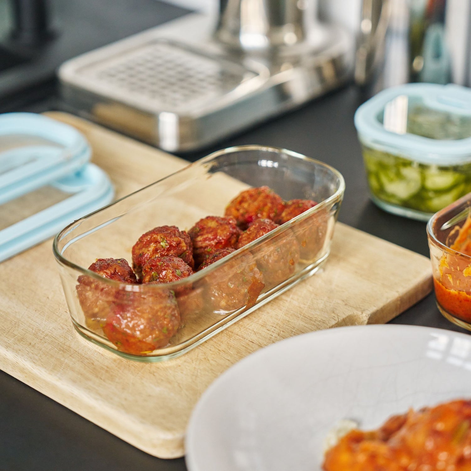 Der Glaskörper unserer Frischhaltedosen besteht aus hitzebeständigem Borosilikatglas und ist für Backofen und Gefrierschrank geeignet. Du kannst direkt im Glas backen, deine Speisen abkühlen lassen, verschließen und anschließend im Kühlschrank oder Gefrierfach lagern.