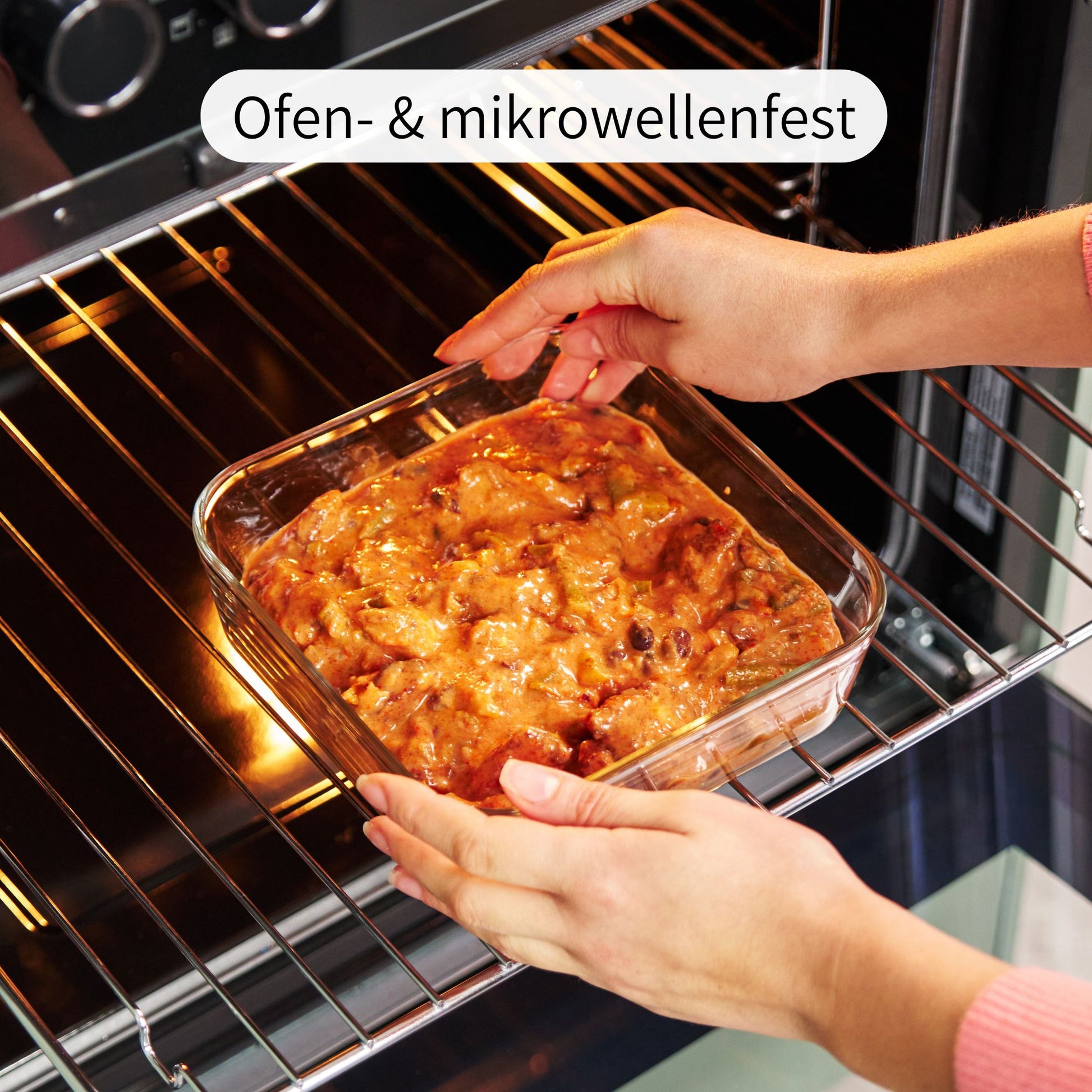 Die flache, eckige Form lässt sich wie eine Auflaufform nutzen – nur dass du dein Essen anschließend direkt mit Glasdeckel verschließen, im Kühlschrank lagern oder einfrieren kannst. So sparst du dir Umfüll-Chaos, Alufolie und Frischhaltefolie.