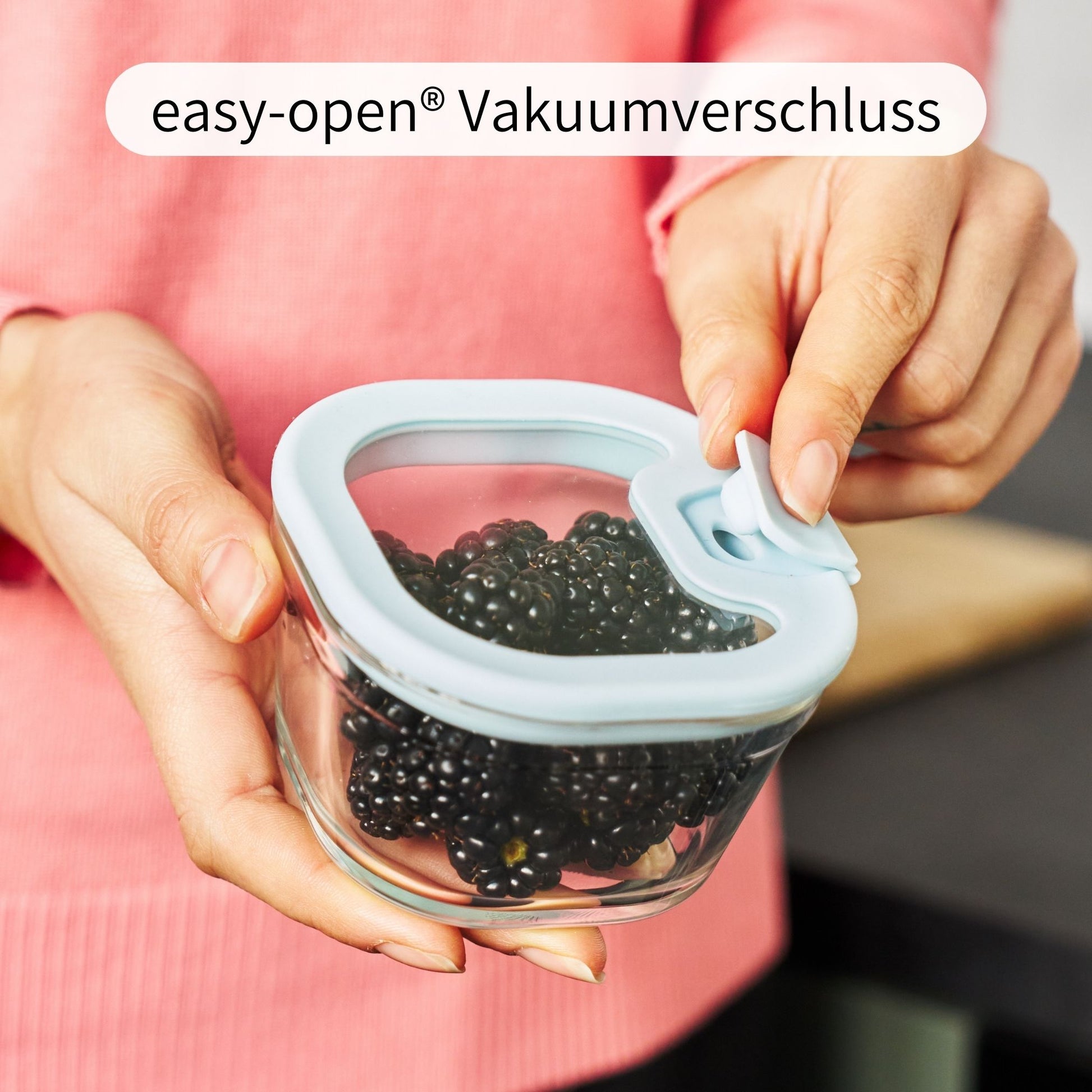 Durch das Glasfenster im Deckel siehst du sofort, was im Kühlschrank wartet. Das Ventil im Deckel sorgt für ein sanftes Vakuum: Luft raus, Frische rein – für weniger Food Waste und mehr Genuss.
