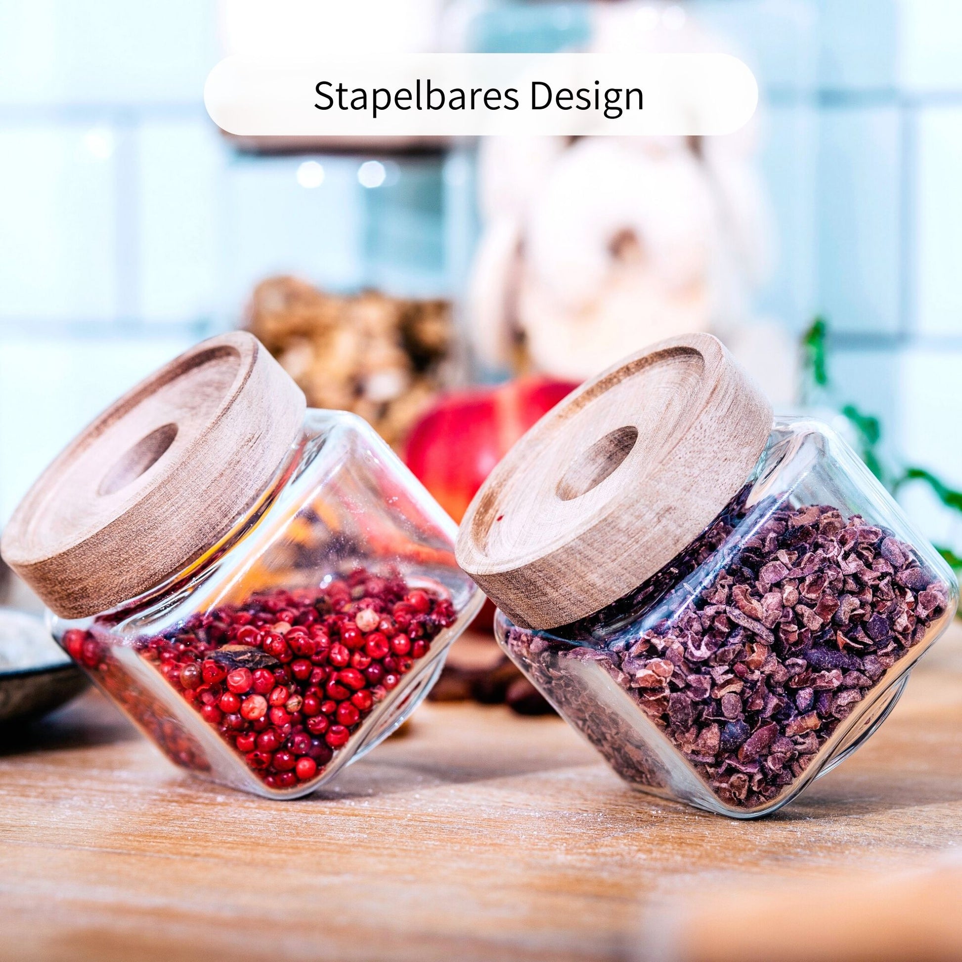 Unsere kleinen eckigen Vorratsgläser eignen sich optimal, um Gewürze in Szene zu setzen. Das 6-tlg. Gewürzgläser Set bietet eine Aufbewahrungsmöglichkeit für ein vielfältiges Gewürzsortiment. Dank des runden Holzdeckels sind die eckigen Gewürzgläser auch mit unseren runden Gewürzgläsern stapelbar.