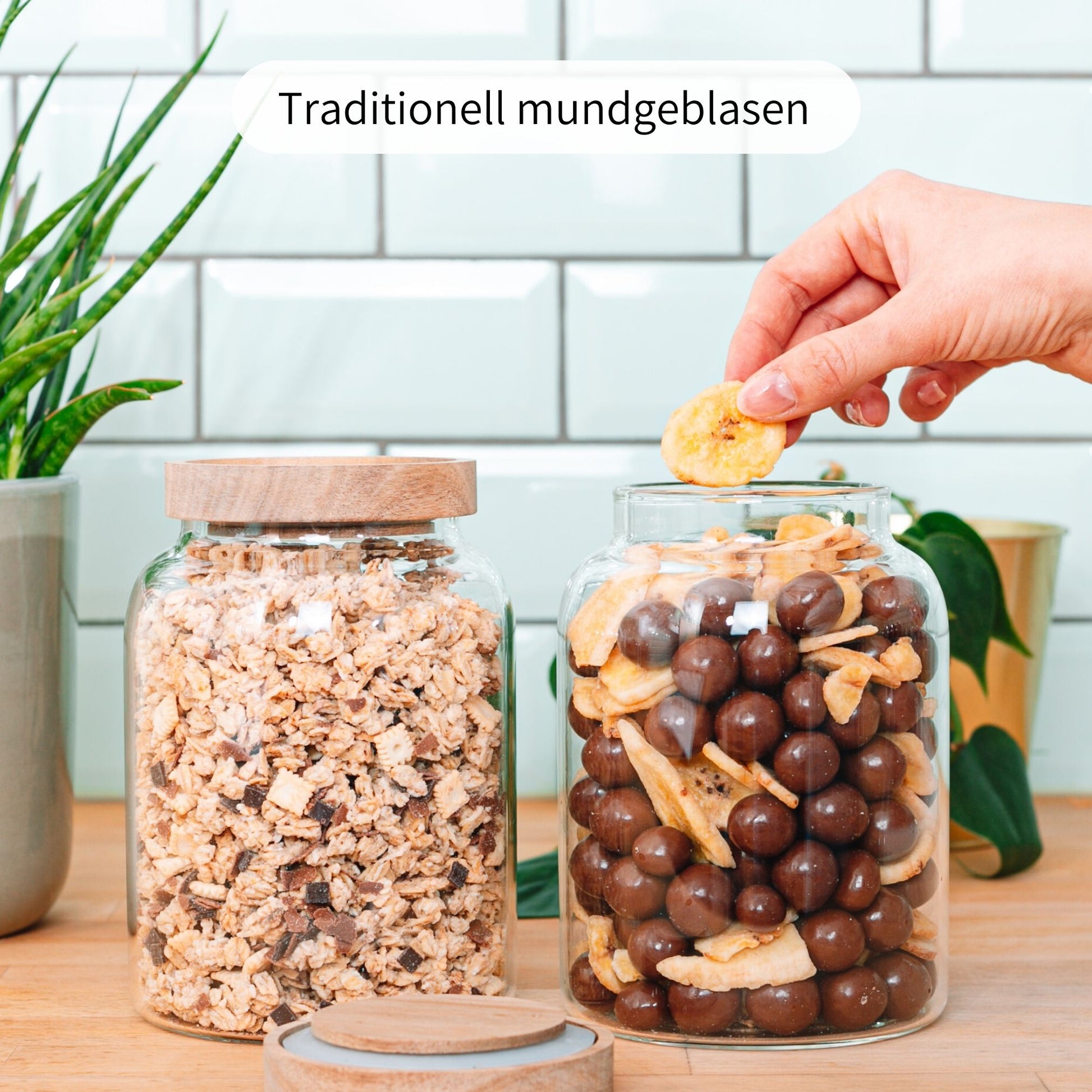 Unsere Vorratsgläser werden traditionell mundgeblasen und bestehen ausschließlich aus recycelbarem Borosilikatglas & naturbelassenem Akazienholz!