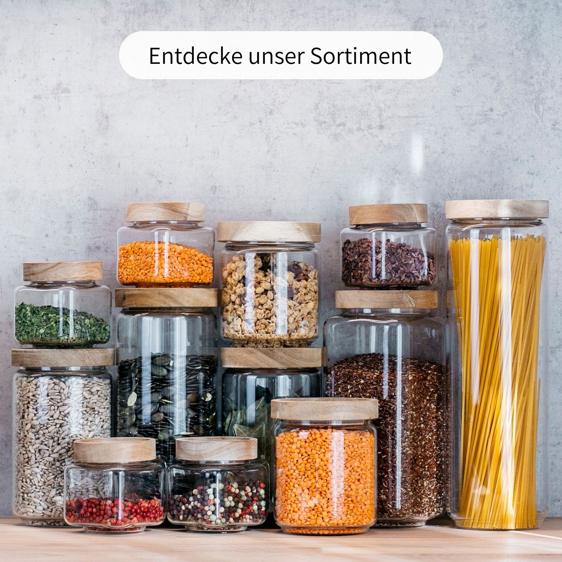 Unsere Vorratsgläser werden traditionell mundgeblasen und bestehen ausschließlich aus recycelbarem Borosilikatglas & naturbelassenem Akazienholz!